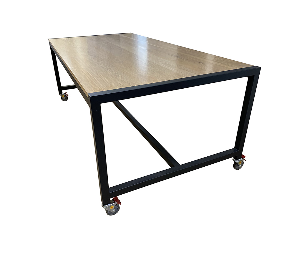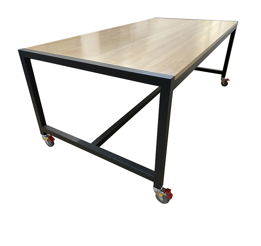 Extra strong base of 50 x 50 x 1.6mm wall galvanised steel tube, with or without lockable castors, powder-coated mat black, white, stone grey, or anthracite, and select from commercial melamine, compact laminate, solid timber, or a variety of other specialized top surfaces to suit. Warranty – 10 years.